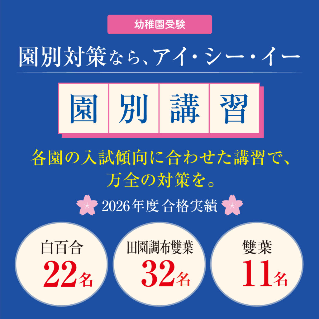/お知らせ/【幼稚園受験】園別講習(白百合・田園調布...【幼稚園受験】園別講習(白百合・田園調布雙葉・雙葉)|申込受付中 幼稚園受験 2025年12月24日 【幼稚園受験】園別講習(白百合・田園調布雙葉・雙葉)|申込受付中 対象 3年保育受験・2年保育受験 日程 2026年1月〜 場所 自由が丘教室|飯田橋教室 ▼ICE会員サイトよりお申し込みください。 園別講習「白百合学園幼稚園」 園別講習「田園調布雙葉小学校附属幼稚園」 園別講習「雙葉小学校附属幼稚園」 お知らせ一覧へ戻る 新着情報 2026年02月13日 【無料】私立小編入がわかるセミナー|申込受付中 2026年02月04日 春期講習|申込受付中 2026年01月23日 【小学校受験】チャレンジテスト(新年中対象)|申込受付中 2026年01月23日 【小学校受験】総合模擬試験(新年長対象)|申込受付中 2025年12月24日 【幼稚園受験】園別講習(白百合・田園調布雙葉・雙葉)|申込受付中 2025年12月24日 【幼稚園受験】2026年度合格実績 カテゴリー 共通 幼稚園受験 小学校受験 モンテッソーリ 知育 私立小学校編入